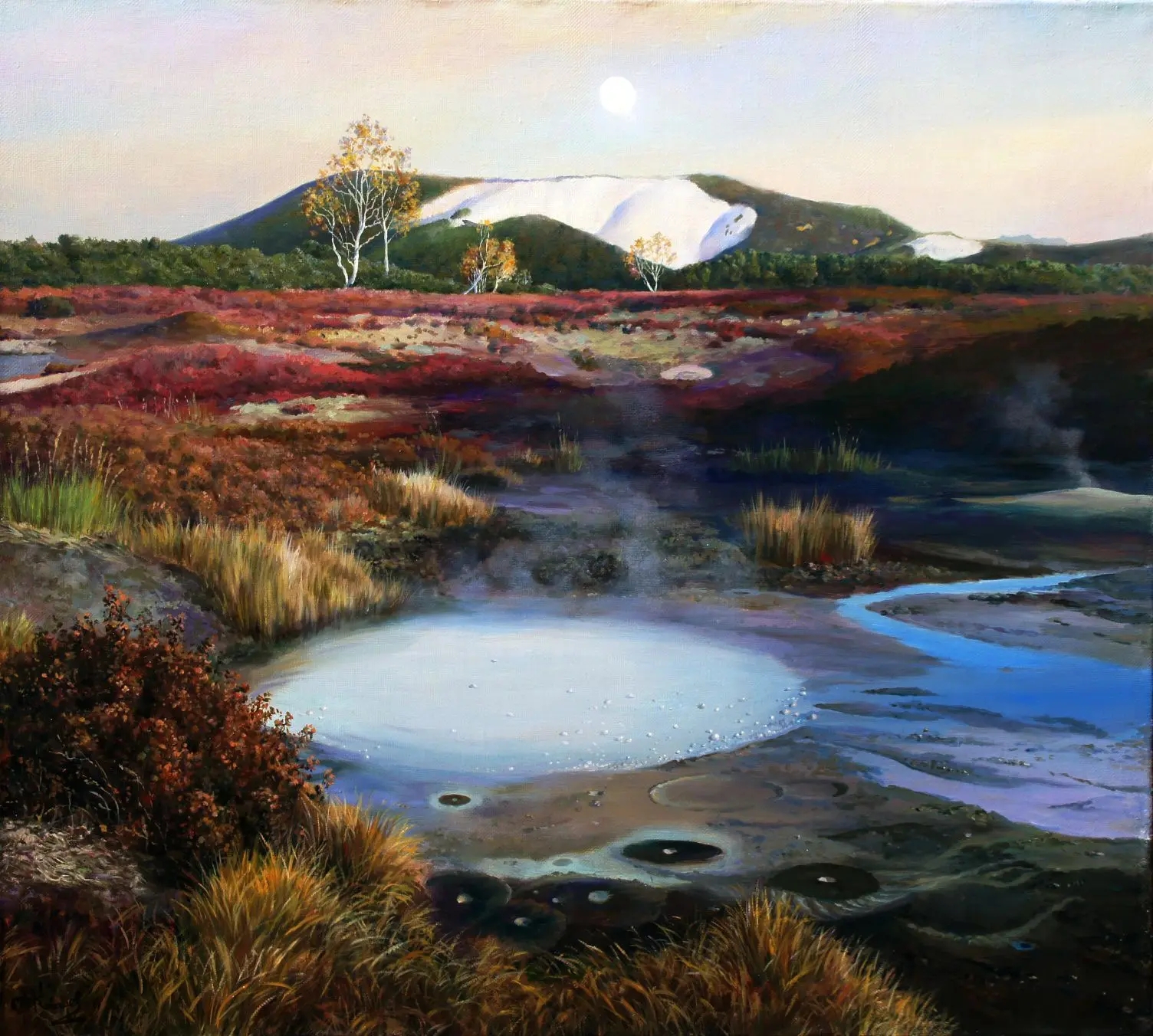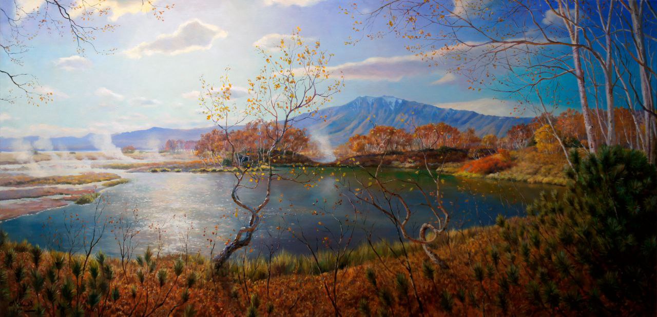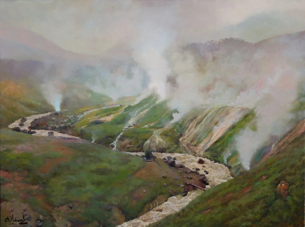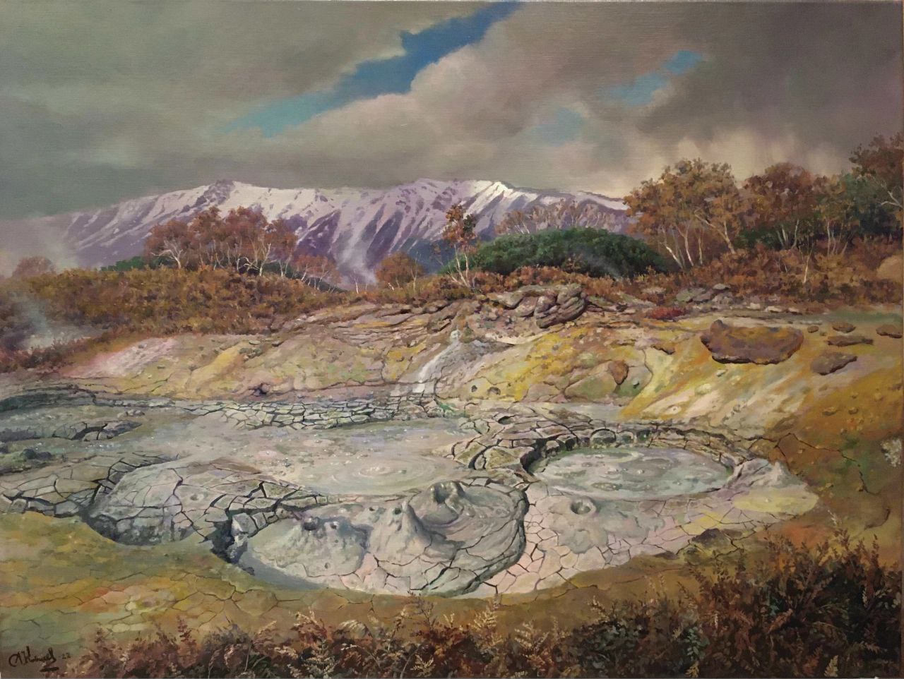 «Ручей Комариный», х.м., 70Х100 см. 2017 г. Художник Артур Ковалев. Ручей "Комариный" находится в кальдере вулкана Узон на полуострове Камчатка. Диаметр затухающего вулкана 20 км. В кальдере протекают геотермальные процессы, есть пресные, хлоридные, фумарольные, кислотные озёра, множество ручьёв, периодически извергается гейзер "Шаман", грязевые микро-вулканы строят фантастические формы. Наряду с этим в кальдере богатая флора и фауна, дикие птицы и животные дополняют первозданную красоту природы. Картина создана с натурного этюда. Узнать цену и наличие