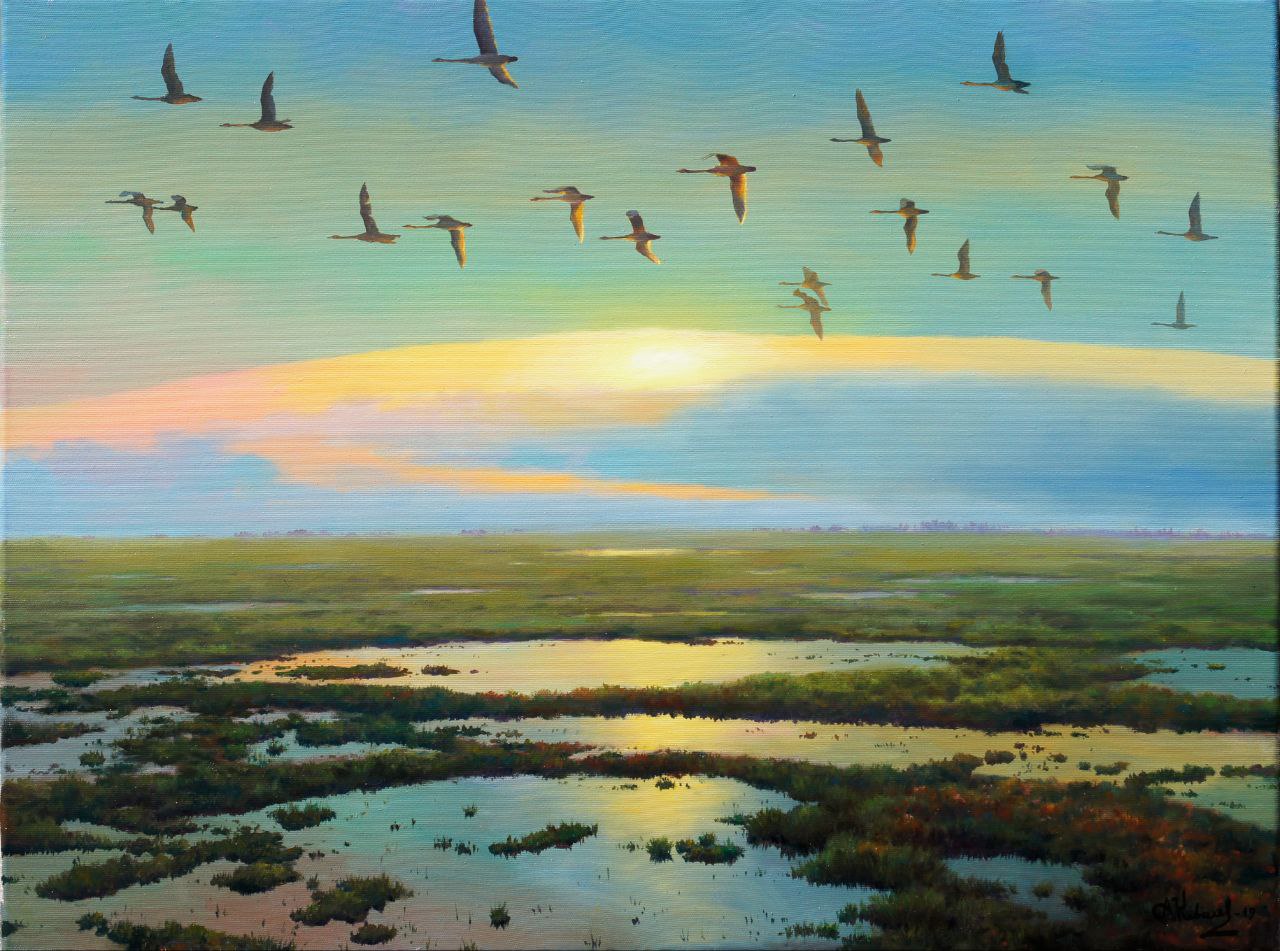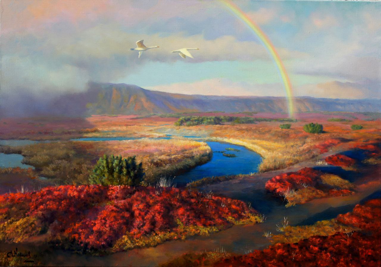 На картине изображен момент возвращения лебедей в родные места, на край полуострова Ямал. Самое начало июня, в диких и безлюдных просторах севера каждая пара создает своё продолжение-потомство, чтобы потом вернуться на юг. Ямал - край первозданной природы. Удивительный край полноводных рек, чистейших озер и сурового климата, где каждая ягода или цветок, выросшие под полярным солнцем кажутся настоящим произведением искусства в богатой сокровищнице. Ямал- считается, что это слово в переводе с ненецкого означает "край (или конец) земли". Узнать цену и наличие